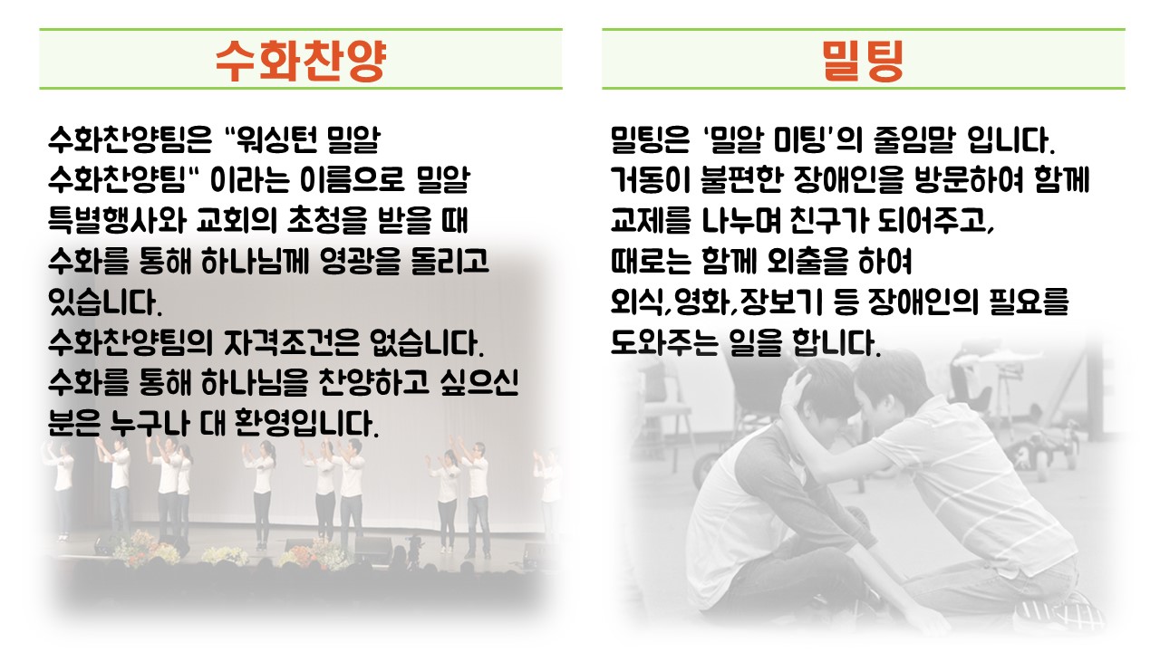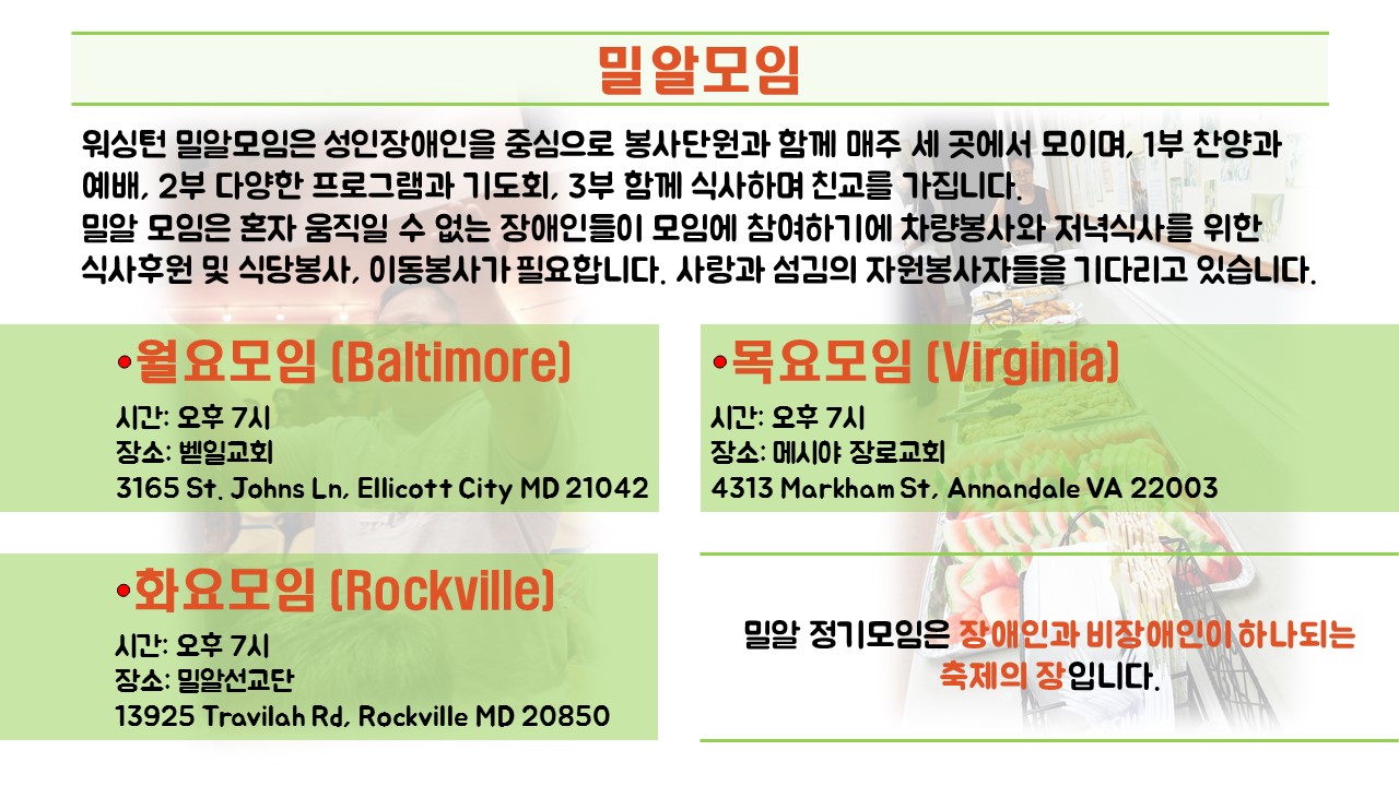 워싱턴 밀알모임은 성인 장애인을 중심으로 봉사단원과 함께 매주 세 곳에서 모이며, 1부 찬양과 예배, 2부 다양한 프로그램과 기도회, 3부 함께 식사하며 친교를 갑니다.