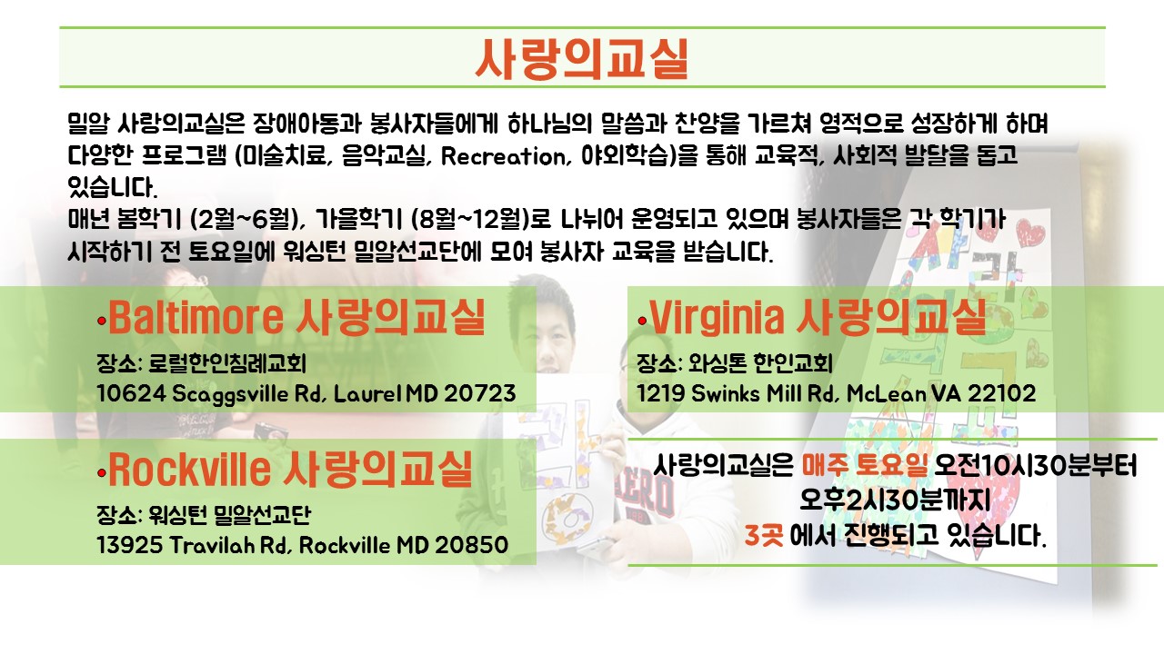 워싱턴 밀알선교단 (American Wheat Mission, Inc) 13925 Travilah Rd., Rockville, MD 20850, Tel: (301) 294-6342 | (240) 335-2278, Email: milalusa@gmail.com Copyright © 2012 워싱턴 밀알선교단 (American Wheat Mission in Washington). All Rights Reserved.